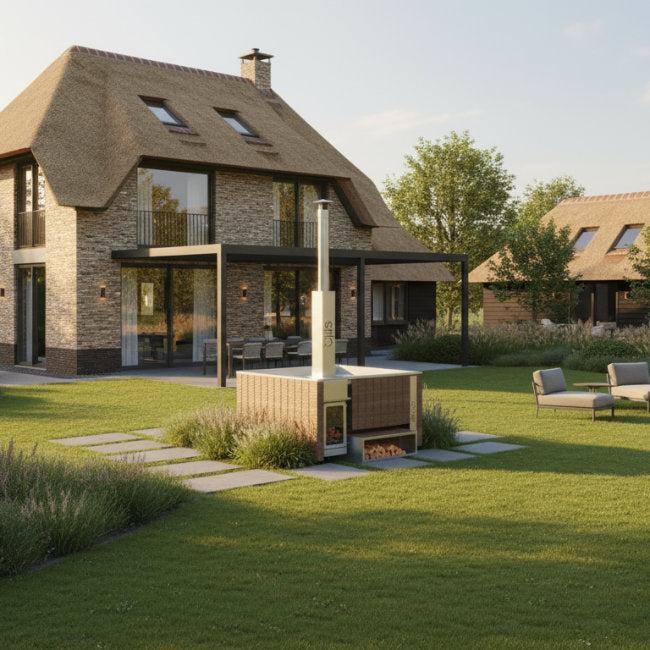 Dit model biedt een perfecte balans tussen de traditionele houtgestookte hottub en moderne, hygiënische waterbehandeling.